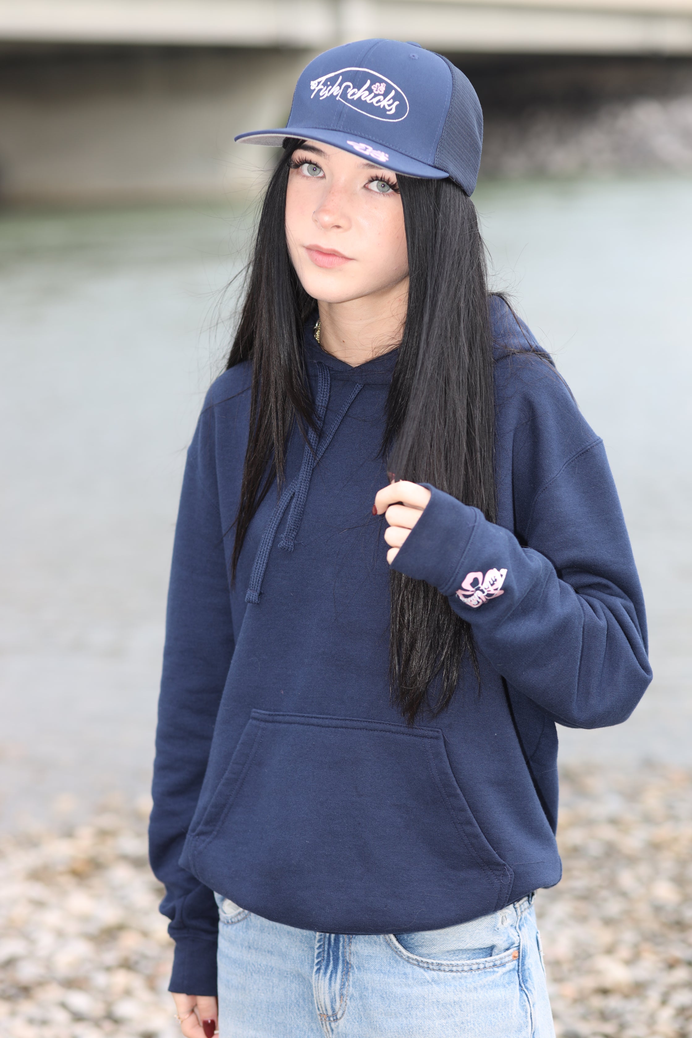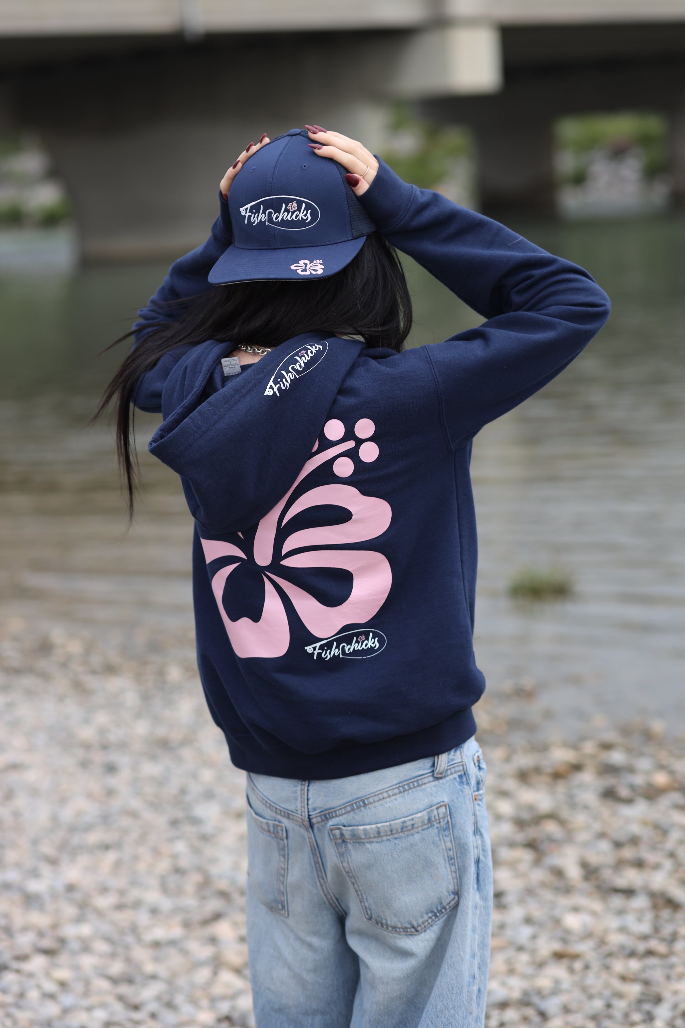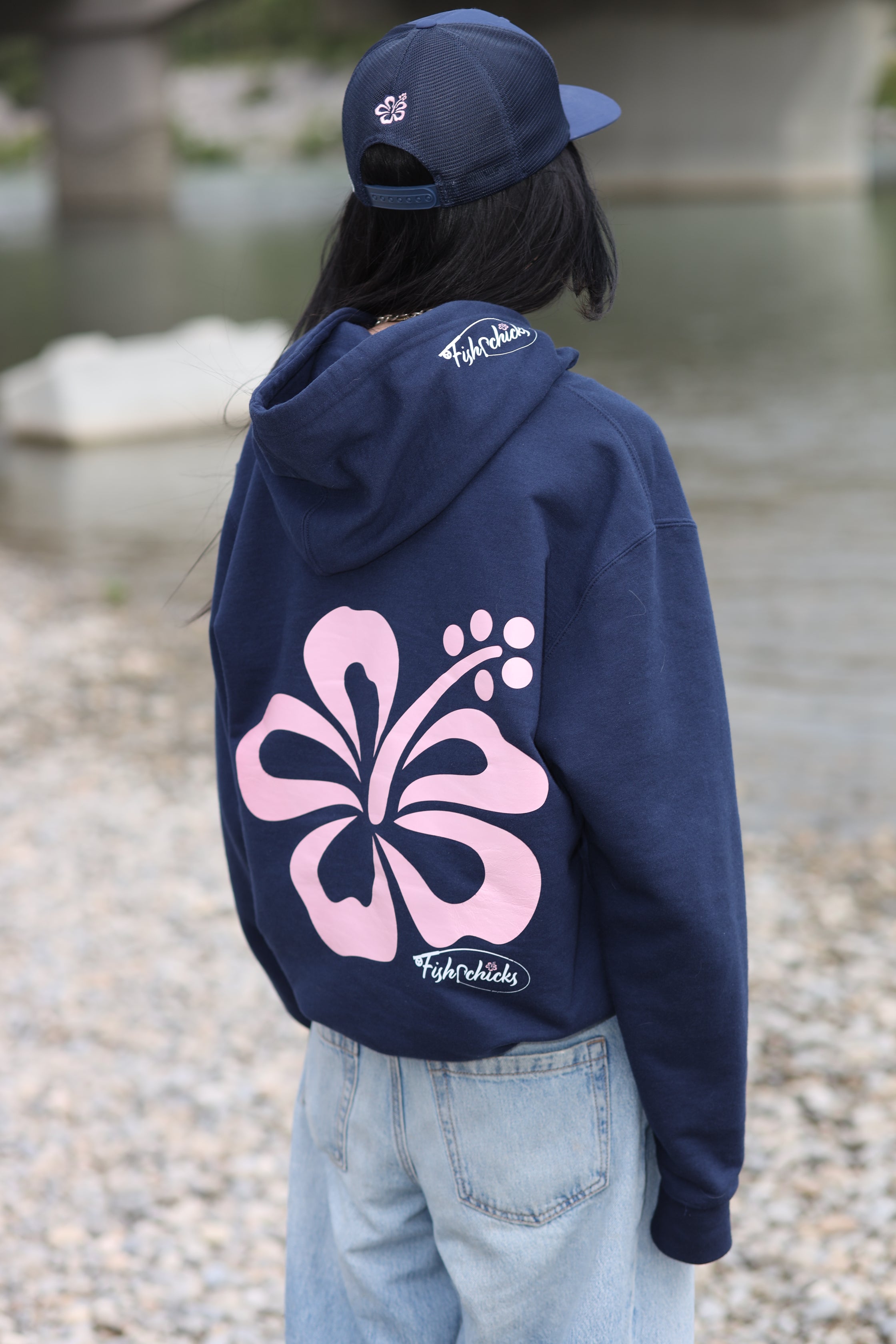 The subtle hibiscus across the front adds a fresh, tropical style. The hood gives extra warmth when winds pick up. There is a front pocket for your hands or keys. This navy hibiscus hoodie also shows off Fishrchicks branding in a low-key way.